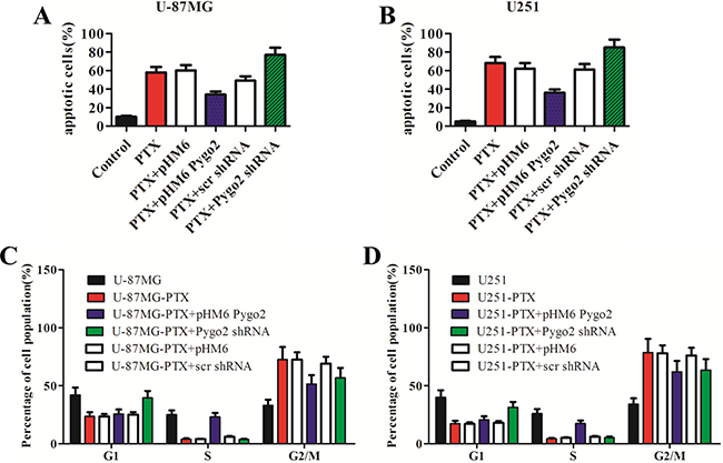 Figure 3: Pygo2 inhibits the PTX-induced apoptosis and G2/M arrest of glioma cells. Cells were treated with 30 nM PTX for 48 h, and the percentage of apoptotic cells (A–B) and mitotic cells (C–D) was determined by flow cytometry after staining the cells with annexin V-FITC and PI. Decreased apoptosis rates were found in the cells expressing exogenous Pygo2 protein after treatment with PTX compared to the cells with low levels of Pygo2, and the sub-G1 index was increased in the Pygo2-knockdown cells. Data are presented as the mean ± SD of three independent experiments.