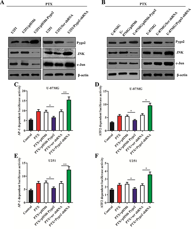 Figure 4: Pygo2 inhibits the activation of the JNK/SAPK pathway and the AP-1 and ATF2 activity. (A–B) The protein levels in the stably transfected cell lines were detected by western blot analysis after treatment with 30 nM PTX for 48 h; β-actin was used as a control. (C, E) AP-1 transcription activity was examined using the reporter plasmid pAP-1-Luc. (D, F) ATF2 transcription activity was examined using the fusion trans-activator plasmid pFA-ATF2. Data are presented as the mean ± SD of three independent experiments. *P < 0.05 and **P < 0.01.