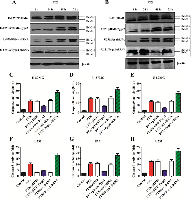 Figure 5: Pygo2 inhibits the phosphorylation of Bcl-2 and the activation of caspases. (A–B) The protein levels in the stably transfected cell lines were detected by western blot analysis after treatment with 30 nM PTX in a time-dependent manner; β-actin was used as a control. (C–F) caspase-3/7 activities were measured with a Caspase-Glo® 3/7 Assay kit. (D–G) Caspase-8 activity was measured with a Caspase-Glo® 8 Assay kit. (E–H) Caspase-9 activity was measured with a Caspase-Glo® 9 Assay kit. Data are presented as the mean ± SD of three independent experiments.