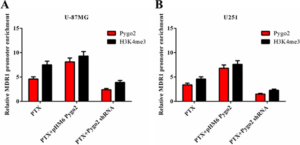 Figure 7: Effect of Pygo2 on the recruitment of transcriptional regulators to the MDR1 promoter. Pygo2 and H3K4me3 occupied the MDR1 promoter following treatment with 30 nM PTX for 8 h in human brain glioma U-87MG (A) and U251 (B) cell lines.