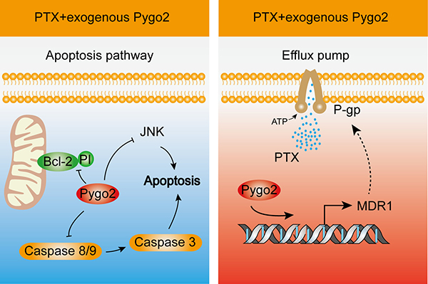 Figure 8: Schematic illustration showing how Pygo2 inhibits the efficacy of PTX-induced apoptosis in human glioma cells. PTX treatment of cells causes a series of apoptotic responses, including phosphorylation of Bcl-2, activation of caspase-8/9, and activation of the JNK pathway, which were inhibited by over-expression of exogenous Pygo2 (Left). Cells also exhibited an increased expression level of MDR1. P-gp acts as an efflux pump that pumps the PTX granules out of cells, and up-regulated expression of P-gp further mediates PTX resistance. Over-expression of exogenous Pygo2, which occupies the promoter of MDR1, enhances the expression of P-gp to strengthen the multidrug resistance (Right).