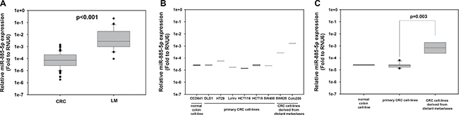 miR-885-5p was significantly up-regulated in liver metastasis and metastatic CRC cell lines