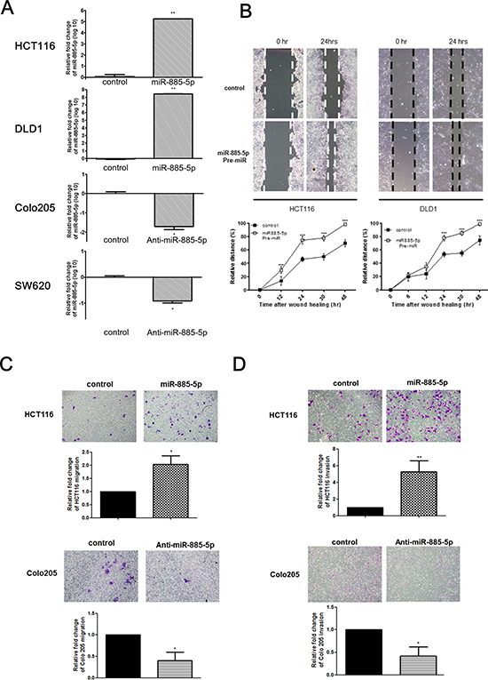 Figure 2: miR-885-5p enhances CRC cells invasive and migratory capacity. (A) The relative expression of miR-885-5p in miR-885-5p overexpressed or control transfected cells (HCT116 and DLD1) and miR-885-5p repressed or control transfected cells (Colo205 and SW620). (B) Wound healing experiment was performed using HCT116 and DLD1 cells transfected with either negative control or Pre-miR miR-885-5p. Representative images of wound were at time 0 hr and 24 hr after monolayer wounding were shown (upper panel). The distance of cell migration was measured every 12 hours and relative distance % was calculated by the formula (initial wound distance –wound distance at time point)/ intial wound distance × 100%. The distance of cell migration was higher in cells transfected with miR-885-5p in both HCT116 and DLD1 cell-lines (lower panel; ***P < 0.001 by student’s t-test). Data is expressed as mean values (± SEM) of triplicate measurements from three independent experiments. (C and D) Transwell cell migration (C) and invasion assays (D) were performed using HCT116 cells transfected with either control or miR-885-5p (upper panel) and Colo205 cells transfected with either negative control or anti-miR-885-5p inhibitor (lower panel). Cells migrated or invaded were stained with 0.2% crystal violet and the number was counted under microscope. The number of cells migrated or invaded was significantly higher in HCT116 cells transfected with miR-885-5p than that with control, and significantly lower in Colo205 cells transfected with anti-miR-885-5p inhibitor than with negative control (*P < 0.05, student’s t-test). Data is expressed as mean values (± SEM) of five measurements in three independent experiments.