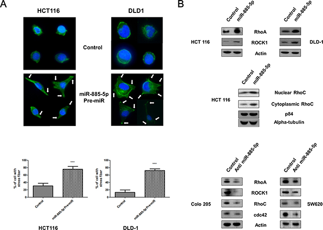 Figure 4: Effect of miR-885-5p on formation of cell protrusions. (A) Upper panel: HCT 116 and DLD-1 cells transfected with negative control or miR-885-5p were stained with phalloidin and DAPI. Representative micrographs showing formation of cell protrusions (indicated by arrows) and signals from F-actin (green) and nucleus (blue). Scale bar: 50 μm. Lower panel: Bar graph showing percentage of cells with cell protrusion formation in five random area. Data is expressed as the mean (± SEM) of three independent experiments. (***P < 0.001, student’s t-test). (B) Analysis of endogenous levels of Rho-GTPase families by immunoblotting in CRC cell lines transiently transfected with pre-miR-885-5p, negative control or anti-miR-885-5p for 48 hours. Total β-actin was used as a loading control.