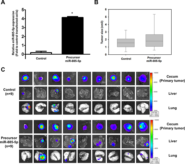 Figure 6: miR-885-5p induces CRC metastasis in vivo. (A) Real-time RT-PCR was used to determine miR-885-5p expression level in luciferase-labelled HCT116 cell line stably transduced with empty lentivector (control) or precursor miR-885-5p. (B) The size of primary tumors developed from stable cells 6 weeks after orthotopically injected into the cecal wall of 9 mice per group. There was no significant difference in tumor size formed from control and miR-886-5p stable cells (P = 0.427). (C) The primary tumors, livers and lungs were excised and presence of tumor cells were detected by capturing the luciferase signal by the IVIS Imaging System. Primary tumors were detected in all mice injected with either control or precursor miR-885-5p stable cells. Liver and lung metastases were detected in only two mice of the control group, while 6 and 5 mice developed liver and lung metastases, respectively, in the miR-885-5p group.