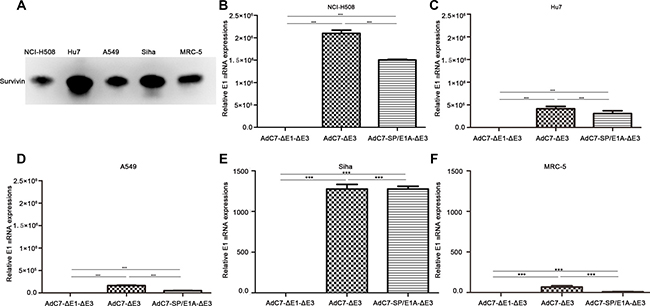 Figure 1: Expression of survivin and E1A genes in different cell types. (A) Western blotting was performed to detect survivin proteins in 1 × 106 cells. (B–F) A panel of NCI-H508 (B), Huh7 (C), A549 (D), SiHa (E), and MRC-5 (F) cells was infected with AdC7-ΔE1-ΔE3, AdC7-ΔE3, and AdC7-SP/E1A-ΔE3 at 10 MOI. E1A mRNA was quantitated by real-time PCR at 24 h post infection. Relative levels of E1A mRNA were shown in reference to GAPDH expression; relative E1 mRNAs in cells infected with AdC7-ΔE1-ΔE3 were defined as 1. Data shown are means ± standard errors of the means (SEM); statistical significance was determined by one-way ANOVA: ***P < 0.0001. Each experiment was performed three times.