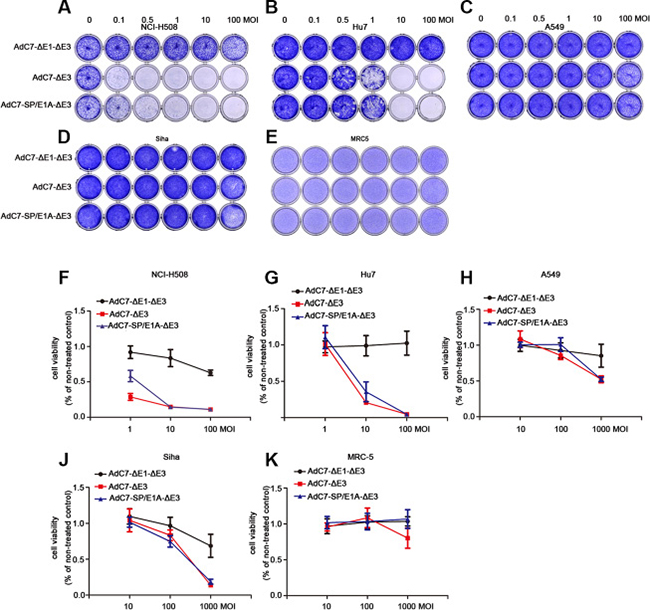 Figure 3: AdC7-ΔE1-ΔE3 induced cytotoxicity of tumor cells. A panel of NCI-H508, Huh7, A549, SiHa, and MRC-5 cells was infected with AdC7-ΔE1-ΔE3, AdC7-ΔE3, and AdC7-SP/E1A-ΔE3 at various MOIs. At 5 d post infection (A–E), cells were stained with crystal violet. Graph represents one of three different experiments. (F–K) Infected cells were subject to MTT assay kat 5 d post infection. Data are presented as means ± SEM of triplicate samples, and are representative of three independent experiments.