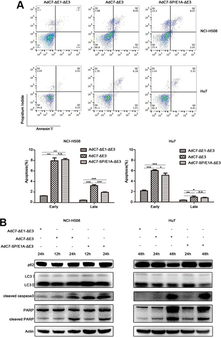 Figure 4: AdC7-ΔE1-ΔE3 trigger tumor cell apoptosis. (A) NCI-H508 and Huh7 cells were infected at 100 MOI with AdC7-ΔE1-ΔE3, AdC7-ΔE3, and AdC7-SP/E1A-ΔE3. Two cells were collected 24 h and 48 h post infection respectively. Flow cytometry was performed to evaluate tumor cell apoptosis after staining NCI-H508 and Huh7 with propidium iodide (PI)/annexin V. Early apoptosis: AV+/PI- (%); later stage apoptosis: AV+/PI+ (%). Data are presented as means ± SEM of triplicate samples, and are representative of three independent experiments. Statistical significance was determined by one way ANOVA: ***P < 0.0001, **< 0.001, *< 0.05. (B) NCI-H508 and Huh7 cells were infected at 100 MOI with AdC7-ΔE1-ΔE3, AdC7-ΔE3, and AdC7-SP/E1A-ΔE3. NCI-H508 cells were collected at 12 h and 24 h post infection, and Huh7 cells were collected 24 h and 48 h post infection. Western blotting was carried out to detect levels of p62, LC3, cleaved caspase3, and cleaved PARP in NCI-H508 and Huh7 cells. β-actin was used as a loading control.