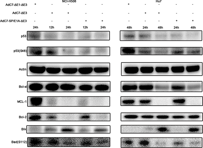 Previous studies [24], in which the E1B-55K and E4-25K proteins of AdHu5 were associated with other cellular proteins to form a ubiquitin ligase complex that polyubiquitinated and degraded p53, implied that AdC7-SP/E1A-ΔE3 also degraded p53. This hypothesis was validated by the data in Figure 5, where p53 levels were markedly lowered in cells infected with AdC7-SP/E1A-ΔE3. These diminished p53 levels indicate that AdC7-SP/E1A-ΔE3 induced apoptosis in a p53-independent manner. It was further validated by the fact that the phosphorylation of p53 at Ser46, which induces the expression of relevant apoptosis genes, was significantly decreased in cells infected with AdC7-SP/E1A-ΔE3 (Figure 5). NCI-H508 infected with AdC7-SP/E1A-ΔE3 exhibited marked drops in levels of pro-survival proteins MCL-1and Bcl-2, while Huh7 exhibited marked drops in levels of pro-survival proteins MCL-1and Bcl-xl (Figure 5). We also note that both NCI-H508 and Huh7 cells have noticeably diminished levels of Bad phosphorylation at serine 112 and have increased expression of Bik (Figure 5).