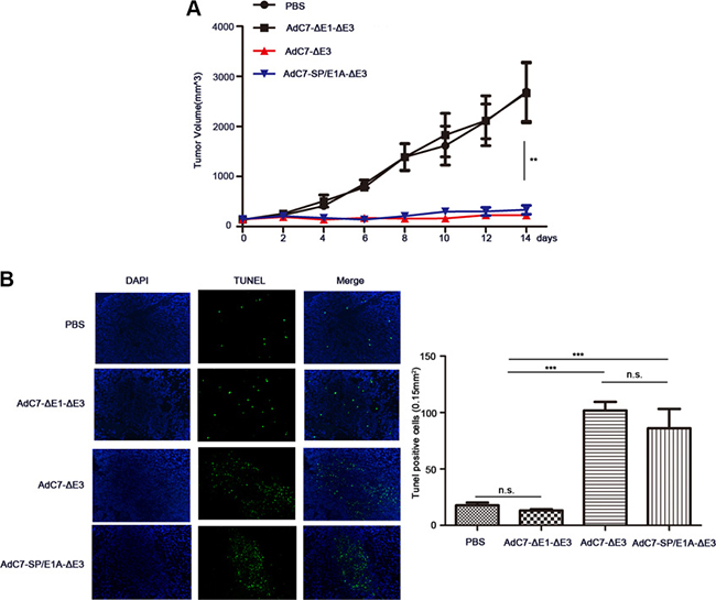 Figure 6: AdC7-SP/E1A-ΔE3 inhibit tumor growth in nude mouse NCI-H508 cell xenografts. NCI-H508 cells (107 ) were inoculated into the right flanks of nude mice, and tumor was injected with 5 × 108 PFU adenovirus (AdC7-ΔE1-ΔE3, AdC7-ΔE3, or AdC7-SP/E1A-ΔE3) suspended in 50 μL of PBS or 50 μL PBS alone when reaching 100–150 mm3. (A) Tumor volume (n = 6) was measured every three days. (B) In left images, TUNEL staining of tumor cells, and in right images, TUNEL positive cells (n = 5) were quantitated. Data are presented as means ± SEM. Statistical significance was determined by one way ANOVA: ***< 0.0001, **< 0.001. Data are representative of two independent experiments.