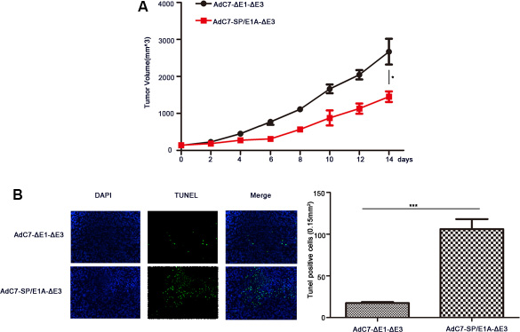 Figure 8: The antitumor efficacy of AdC7-SP/E1A-ΔE3 via systemic administration. Huh7 cells (5 × 106) were inoculated into the right flanks of nude mice, and tumor was injected with 1 × 109 PFU adenovirus (AdC7-ΔE1-ΔE3 or AdC7-SP/E1A-ΔE3) suspended in 50 μL of PBS three times at the interval of one day when reaching 100–150 mm3. (A) Tumor volume (n = 6) was measured every two days. (B) In left images, TUNEL staining of tumor cells, and in right images, TUNEL positive cells (n = 5) were quantitated. Data are presented as means ± SEM. Statistical significance was determined by student’s t test: ***< 0.0001, *< 0.05. Data are representative of two independent experiments.