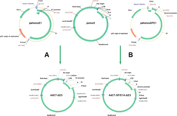 Figure 9: Flowchart of cloning AdC7-ΔE3 and AdC7-SP/E1A-ΔE3. (A, B) Construction of AdC7-ΔE3 and AdC7-SP/E1A-ΔE3. A fragment containing the E1 region was cut from pshoncoE1 and pshoncoSPE1, and inserted into the ponco3 region between I-Ceu / and PI-Sce /. See Methods for more detail.