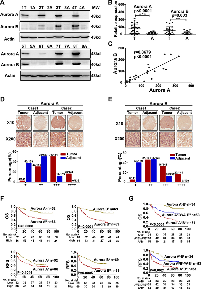 Figure 1: Aurora A and B were overexpressed in parallel and predicted a poorer prognosis in HCC. (A) WB analysis to determine the expression of Aurora A and B in HCCs and adjacent liver tissues and representative results of 8 out of 24 pairs of tissues were shown. (B) Quantification of Aurora A and B expression in HCCs and adjacent liver tissues (n = 24). (C) A positive linear correlation relationship existed between Aurora A and B at the protein level. (D–E) IHC staining of human HCC tissue array using Aurora A and B-specific antibody, respectively, as described in Material and Methods. And the classification of samples according to the intensity of staining of Aurora A and B expression, respectively. (F) Survival correlation analysis of Aurora A and B expression status in HCC, respectively (n = 138). (G) Survival correlation analysis among the groups of Aurora AHighBHigh (Aurora AHBH), Aurora AHighBLow/ALowBHigh (Aurora AHBL/ALBH) and Aurora ALowBLow (Aurora ALBL ),with different Aurora expression status (n = 138). OS, overall surivival rate; RFS, relapsed free survival rate; **p < 0.01, ***p < 0.001.