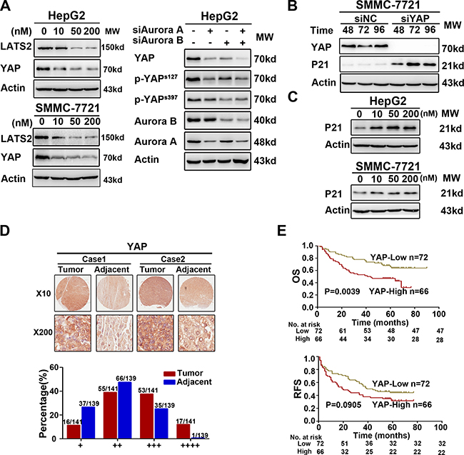 Figure 4: Interference of Aurora kinases contorlled the Hippo pathway and resulted in the accumulation of P21. (A) The key proteins of Hippo pathway was suppressed due to the knockdown or inhibition of Aurora kinases in HepG2. (B) YAP knockdown induced the accumulation of P21 via WB analysis in SMMC-7721. (C) The accumulation of P21 was induced significantly by SNS-314 treatment with indicated concentrations for 96h in HepG2 and SMMC-7721 cells. (D–E) IHC staining of human HCC tissue array using YAP-specific antibody, as described in Material and Methods. And the classification of samples according to the intensity of staining of YAP expression (n = 138). OS, overall surivival rate; RFS, relapsed free survival rate.