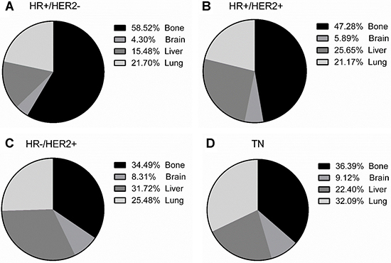 In this large population-based cohort of cases diagnosed with metastatic breast cancer, this study has demonstrated that various breast cancer subtypes show a strong correlation to site-specific metastasis patterns; patients with all subtypes were most prone to bone metastases, and HR−/HER2+ subtype patients had a higher probability of brain metastasis. Further, liver metastasis was more frequently observed in the HER2 positive subtypes compared with HER2 negative subtypes. While patients with TN primarily presented lung metastasis.