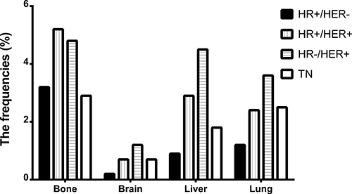 Figure 1: The frequencies of breast cancer subtypes at the sites of distant metastasis. HR: hormone receptor, HER2: human epidermal growth factor receptor 2, TN: triple negative.