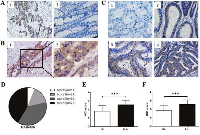 Figure 2: ROR1 expression on CRC tissue microarray by immunohistochemistry staining. (A) The IHC staining of ROR1 expression in breast tumor (1) and its adjacent normal tissue (2). (B) Detection of ROR1 expression in CRC tissues. Positive ROR1 staining was shown in brown color and the nucleus counterstained with hematoxylin was shown in blue color. The magnification was ×200 in B1, ×400 in B2. (C) Different levels of ROR1 expression detected by TMA-IHC analysis. (1) Score 0 indicates that none or little cells exhibit ROR1 expression; (2) score 1 indicates that more than 25% of tumor cells exhibit weak ROR1 expression; (3) score 2 indicates more than 50% of tumor cells have weak expression or more than 25% of tumor cells have moderate ROR1 expression; (4) score 3 indicates more than 75% of tumor cells have moderate expression or more than 50% of tumor cells have strong ROR1 expression. (D) The proportion of negative (score 0), weak (score 1), moderate (score 2) and strong (score 3) staining for ROR1 protein in CRC patients. (E) The scores of ROR1 in CRC tissues at different stages were analyzed by two tail t-test (P < 0.001). (F) The scores of ROR1 in CRC tissues with different status of lymph node metastasis were analyzed by two tail t-test (P < 0.001). LN, lymph node.