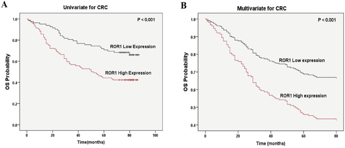 Figure 3: Correlation of ROR1 expression with overall survival in CRC patients. (A) Kaplan-Meier survival analysis of ROR1 expression in CRC patients. The low ROR1 expression group had longer OS than the high ROR1 expression group. (B) Multivariate Cox regression survival analysis in CRC patients. ROR1 expression could serve as an independent prognostic factor.
