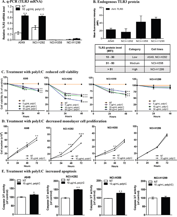 Figure 1: Lung cancer cells exhibit differential TLR3 expression and susceptibility to polyI:C. (A) Real-time qPCR analysis of Tlr3 mRNA levels relative to Hprt, in lung cancer cells after 24-h polyI:C treatment. (B) Flow cytometric analysis of endogenous TLR3 protein levels presented as mean fluorescence intensity (MFI) of TLR3 protein labelled with FITC-conjugated anti-TLR3 antibody after normalization with IgG isotype control. Table shows the range of TLR3 protein levels and the category of lung cancer cells. (C) Cell viability of lung cancer cells treated with increasing doses of polyI:C (5, 10, 50 μg/mL) over 48 h. NT indicates non-treated PBS control (without polyI:C). (D) Monolayer cell proliferation was measured by total cell number. Cells were treated with 10 μg/mL polyI:C over 72 h. (E) Apoptosis measured by activation of caspase 3/7 activity, was analysed by caspase-glo 3/7 luminescent assay. Cells were treated with 10 μg/mL polyI:C for 24 h followed by 30 min incubation with caspase-glo 3/7 reagent. The caspase 3/7 activity is presented as percent of luminescence of polyI:C-treated cells relative to that of control NT cells. *P<0.05, **P<0.01, ***P<0.001.