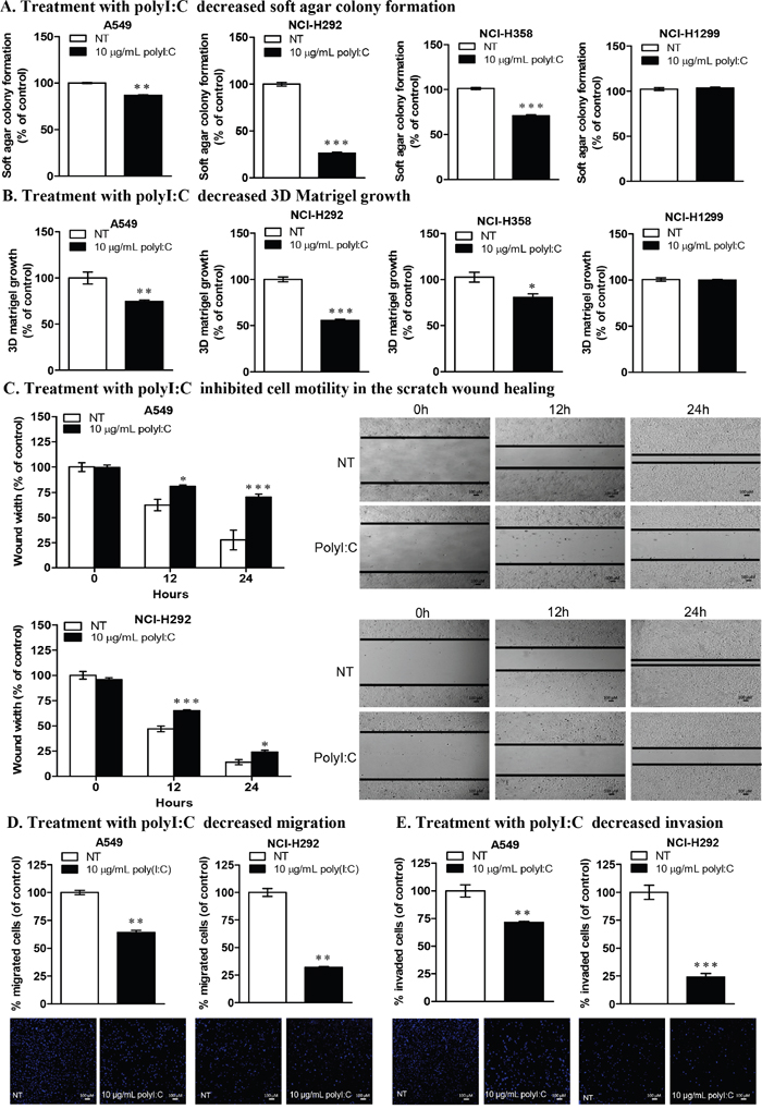 Figure 2: PolyI:C suppresses oncogenicity, cellular motility, migration and invasion of A549 and NCI-H292 cells. (A) Soft colony formation of lung cancer cells treated with polyI:C for assessment of anchorage-independent growth over 12 days. Cells were treated with 10 μg/mL polyI:C consecutively every 3 days over a period of 12 days and the viability of the colony formed in the soft agar was measured by Alamar blue assay. Control NT cells were treated with PBS (without polyI:C). Enumerated soft agar colonies are presented as percent polyI:C-treated cells relative to NT cells. (B) 3D matrigel growth of cells treated with 10 μg/mL polyI:C consecutively every 3 days over 7 days. The viability of the cell colony formed in the matrigel was quantified and data presented as described in (A). (C) Scratch wound healing assay to measure cellular motility and wound closure rate of A549 and NCI-H292 cells treated with polyI:C at different time intervals (0, 12, 24 h). The wound closure rate and wound width restoration was analysed using ImageJ software. The wound width is presented as percent polyI:C-treated cells relative to NT cells. The representative images of the wounded areas were taken after polyI:C treatment at different time intervals. (D and E) Migration and invasion of A549 and NCI-H292 were determined by transwell migration /invasion assays. Cells were treated with 10 μg/mL polyI:C for 24 h and the migrated /invaded cells underneath the transwell insert were stained by Hoechst 33342, and counted under fluorescence microscopy. The invasion potency was determined using 2% matrigel pre-coated transwell invasion assay. The data are presented as percent of polyI:C-treated cells relative to NT. Images were taken at 40x magnification. Bar, 100 μM; *P<0.05, **P<0.01, ***P<0.001.