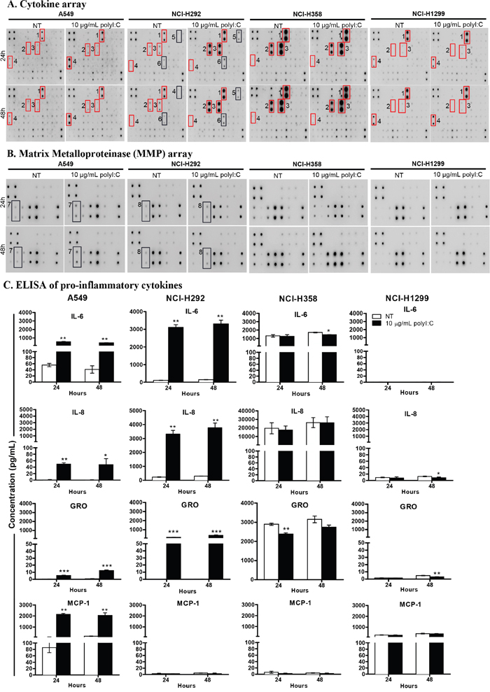 Figure 5: PolyI:C stimulated differential secretion of pro-/anti- inflammatory cytokines and matrix metalloproteinase in lung cancer cells. Cells were treated with 10 μg/mL polyI:C for 24 and 48 h and the culture supernatants were collected for measurement of secreted cytokines using human cytokine array and ELISA. (A) A549 secreted high levels of GRO, IL6, IL8 and MCP-1; NCI-H292 generated high levels of GRO, IL6, IL8, IL-1α, and RANTES but produced low level of MCP-1; NCI-H358 secreted saturating levels of GRO, IL6, IL8 but produced low level of MCP-1; NCI-H1299 secreted very low level of GRO, IL6, IL8 and moderate level of MCP-1. Red boxes indicate significant increase of cytokines secreted by polyI:C-treated cells compared to NT cells and these cytokines were then validated by ELISA. (B) PolyI:C stimulated differential secretion of matrix metalloproteinase (MMP) in lung cancer cells. Cells were treated as described above and the culture supernatants were measured for MMP using human MMP cytokine array. Different levels of MMP isoforms were produced: A549 secreted MMP10 while NCI-H292 secreted MMP13, whereas NCI-H359 and NCI-H1299 were unresponsive to polyI:C and did not secrete any MMPs. The numbers next to the red/black boxes indicate: (1) GRO, (2) IL6, (3) IL8, (4) MCP-1, (5) IL-1α, (6) RANTES, (7) MMP10, (8) MMP13. (C) ELISA confirmed differential quantities of IL6, IL8, GRO and MCP-1 secreted from different lung cancer cells. *P<0.05, **P<0.01, ***P<0.001.
