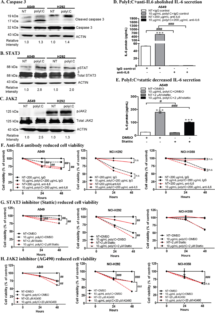 Figure 6: PolyI:C increased caspase 3, STAT3, JAK2 activities and combinatorial treatment with polyI:C+anti-IL6 or polyI:C+inhibitors (Stattic /AG490) enhanced the polyI:C-killing of A549 and NCI-H292. (A) Treatment of cells with 10 μg/mL polyI:C for 24 h increased the expression of cleaved caspase 3 (19, 17 kDa). Whole cell lysates were analysed by Western blot. PolyI:C stimulation increased phosphorylation of (B) STAT3 and (C) JAK2 in both A549 and NCI-H292. Band intensities were quantified by ImageJ software with β-actin as the loading control. The relative intensities were calculated by polyI:C-treated against control NT. (D) ELISA of cell culture supernatant of A549 after combinatorial treatment with polyI:C+anti-IL6 for 24 h shows abolishment of IL6 secretion. (E) ELISA of cell culture supernatant of A549 after combinatorial treatment with polyI:C+Stattic for 24 h shows decreased IL6 secretion (black bars). (F) A combinatorial treatment with polyI:C+anti-IL6 antibody for 24 h enhanced polyI:C-killing of A549 but have no effect on NCI-H292 and NCI-H358. Cell viability was analyzed by MTT assay. Control cells (NT) were treated with IgG as isotype control and without polyI:C. Cell viability is presented as percent of polyI:C-treated cells +/- anti-IL6 antibody relative to NT. Combinatorial treatments with: (G) polyI:C+Stattic and (H) polyI:C+AG490 for 24 h enhanced polyI:C-killing of both A549 and NCI-H292 but have no effect on NCI-H358. Control cells (NT) were treated with DMSO as vehicle control and without polyI:C. Cell viability is presented as percent of polyI:C-treated cells +/- Stattic (G) or AG490 (H), relative to NT. *P<0.05, **P<0.01, ***P<0.001 indicate polyI:C treated cells vs. untreated cells. n.s, non-significant; #P<0.05, ##P<0.01, ###P<0.001 indicate cells treated with a combinatorial vs. no combinatorial treatment.