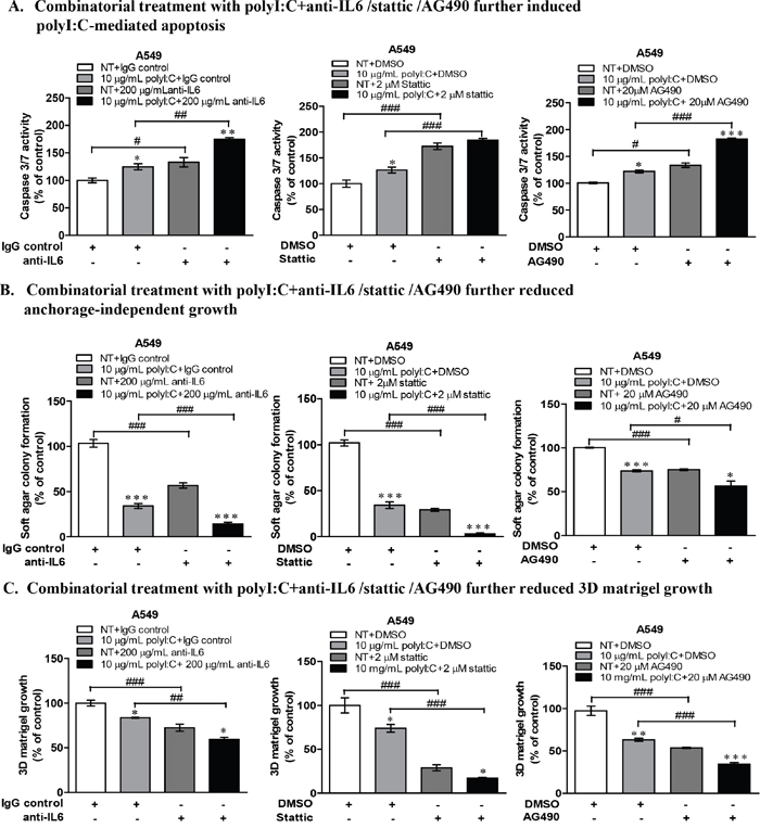 Figure 7: Combinatorial treatment of A549 cells with polyI:C+anti-IL6 or polyI:C+inhibitors (Stattic /AG490) enhanced polyI:C-killing and further reduced oncogenicity. (A) Combinatorial treatments with anti-IL6 /Stattic /AG490 for 24 h enhanced polyI:C-induced apoptosis of A549. Caspase 3/7 activity was analyzed by caspase-glo 3/7 assay. Apoptosis is presented as percent of caspase 3/7 activity in the polyI:C treated cells +/- combinatorial treatment relative to NT. (B) Combinatorial treatments with anti-IL6 /Stattic /AG490 for 24 h further reduced anchorage-independent growth of A549. Cells were consecutively treated for 12 days and viability of the colony formed in the soft agar was analyzed by Alamar blue assay. Soft agar colony formation is presented as percent of polyI:C-treated cells +/- combinatorial treatment, relative to control cells. (C) Combinatorial treatments with anti-IL6 /Stattic /AG490 for 24 h further reduced 3D matrigel growth. Cells were consecutively treated for 7 days and viability of the colony formed in the matrigel was analyzed by Alamar blue assay.3D matrigel growth is presented as percent of polyI:C-treated cells +/- combinatorial treatment relative to NT. *P<0.05, **P<0.01, ***P<0.001 indicate polyI:C treated cells vs. untreated cells. n.s, non-significant; #P<0.05, ##P<0.01, ###P<0.001 indicate cells under combinatorial vs. no combinatorial treatment.