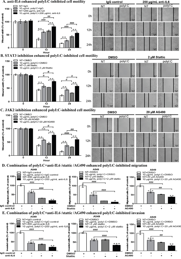 Figure 8: Combinatorial treatment of A549 with polyI:C+anti-IL6 or polyI:C+inhibitors (Stattic /AG490) enhanced polyI:C-killing and suppressed cell motility, migration and invasion. Scratch wound assay to assess cellular motility and wound closure rate of A549 cells treated for different time intervals (0, 12, 24 h) with: (A) polyI:C+anti-IL6 antibody; (B) polyI:C+Stattic; (C) polyI:C+AG490. Wound closure rate and wound width were measured using ImageJ software. Wound width is presented as percent polyI:C-treated cells +/- combinatorial treatment relative to NT. The representative microscopy images of the wounded areas were examined under 40× magnification. (D) Migration and (E) Invasion were measured after 24-h treatment of A549 cells with polyI:C+anti-IL6 antibody or polyI:C+Stattic or polyI:C+AG490. The migrated or invaded cells underneath the transwell insert were stained by Hoechst 33342, and counted under fluorescence microscopy. The representative images of migrated cells were examined under ×40 magnification. The migrated and invaded cells are presented as percent of cells treated with a combinatorial treatment relative to control NT cells. Bar, 100 μM; *P<0.05, **P<0.01, ***P<0.001 indicate polyI:C-treated cells vs. untreated cells. n.s, non-significant; #P<0.05, ##P<0.01, ###P<0.001 indicate cells treated with combinatorial vs. no combinatorial treatment.