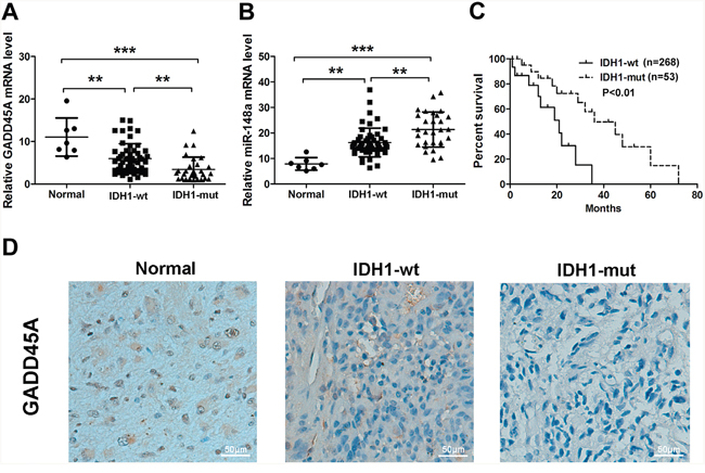 Figure 1: GADD45A and miR-148a expression in normal tissues and IDH1WT or IDH1R132H glioma tissues. (A–B) qRT-PCR analysis of GADD45A and miR-148a mRNA expression in the three tissue types. (C) Kaplan-Meier analysis of the relationship between IDH1R132H (n=53) and IDH1WT (n=268) with patient survival in glioma patients (P<0.01, Log-rank test). (D) GADD45A immunostaining revealed lower protein expression in IDH1R132H glioma tissues compared with normal tissues and IDH1WT gliomas. Magnification: ×200. **P<0.01, ***P<0.001.