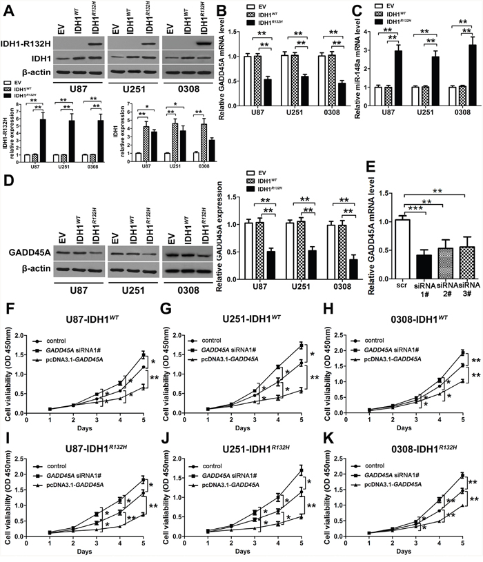 Figure 2: GADD45A inhibits cell proliferation in vitro. (A) Western blot analysis of IDH1WT and IDH1R132H protein expression in U87 and U251 glioblastoma cell lines and GSC 0308 cells after stable transfection with empty vector (EV), IDH1WT, and IDH1R132H. (B–C) qRT-PCR analysis of GADD45A and miR-148a expression in U87 and U251 glioblastoma cell lines and GSC 0308 cells stably transfected with EV, IDH1WT, and IDH1R132H. (D) Western blot analysis of GADD45A expression in U87, U251 glioblastoma cell lines and GSC 0308 stably transfected with EV, IDH1WT, or IDH1R132H. (E) GADD45A was silenced in U87 cells by three different siRNAs (siRNA#1–3) as shown by qRT-PCR. (F–K) The effect of GADD45A knockdown and overexpression on cell viability in IHD1WT or IDH1R132H U87, U251, and GSC 0308 cells. Non-transfected IHD1WT or IDH1R132H U87, U251 and 0308 cells were used as controls. *P<0.05, **P<0.01, ***P<0.001.