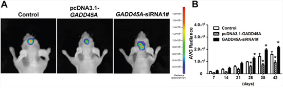 Figure 3: GADD45A inhibits tumor growth in vitro. (A) Implanted U87 MG-luc2 cells stably expressing pcDNA3.1-GADD45A or GADD45A-siRNA1# are visible in mouse brains as red–blue signals. Red indicates the highest Bioluminescence imaging (BLI) signal intensity. The BLI signal intensity increased from day 42, indicating progressive growth of the glioblastoma xenograft. (B) Average IVIS values of mice, data are expressed as mean ± SD. *P<0.05.