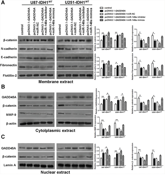 Figure 5: miR-148a partly stimulates β-catenin, MMP-9, and the epithelial-mesenchymal transition by downregulating GADD45A in IDH1WT glioblastoma cells. (A) Western blot analysis of β-catenin, N-cadherin, E-cadherin, and fibronectin expression in membrane extracts. Flotillin-2 was used as a membrane marker. (B) Western blot analysis of GADD45A, β-catenin, and MMP-9 expression in cytoplasmic extracts. β-actin was used as a control. (C) Western blot analysis of β-catenin and GADD45A expression in nuclear extracts. Lamin A was used as a control. All extracts were prepared from IDH1WT U87 and U251 glioblastoma cells. *P<0.05, **P<0.01.
