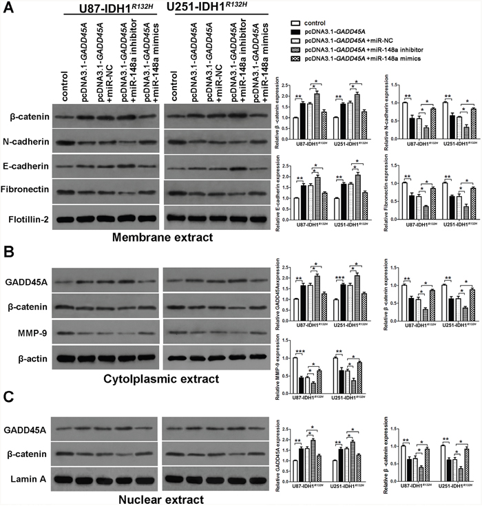 Figure 6: miR-148a stimulates β-catenin, MMP-9, and the epithelial-mesenchymal transition by inhibiting GADD45A in IDH1R132H glioblastoma cells. (A) Western blot analysis of β-catenin, N-cadherin, E-cadherin, and fibronectin expression in membrane extracts. Flotillin-2 was used as a membrane marker. (B) Western blot analysis of GADD45A, β-catenin, and MMP-9 expression in cytoplasmic extracts. β-actin was used as a control. (C) Western blot analysis of β-catenin and GADD45A expression in nuclear extracts. Lamin A was used as a control. All extracts were prepared from IDH1R132H U87 and U251 glioblastoma cells. *P<0.05, **P<0.01, ***P<0.001.