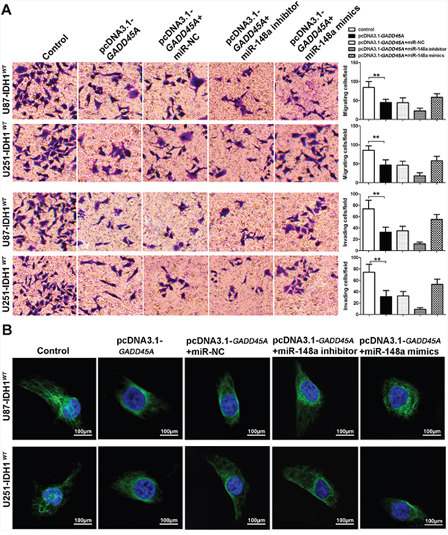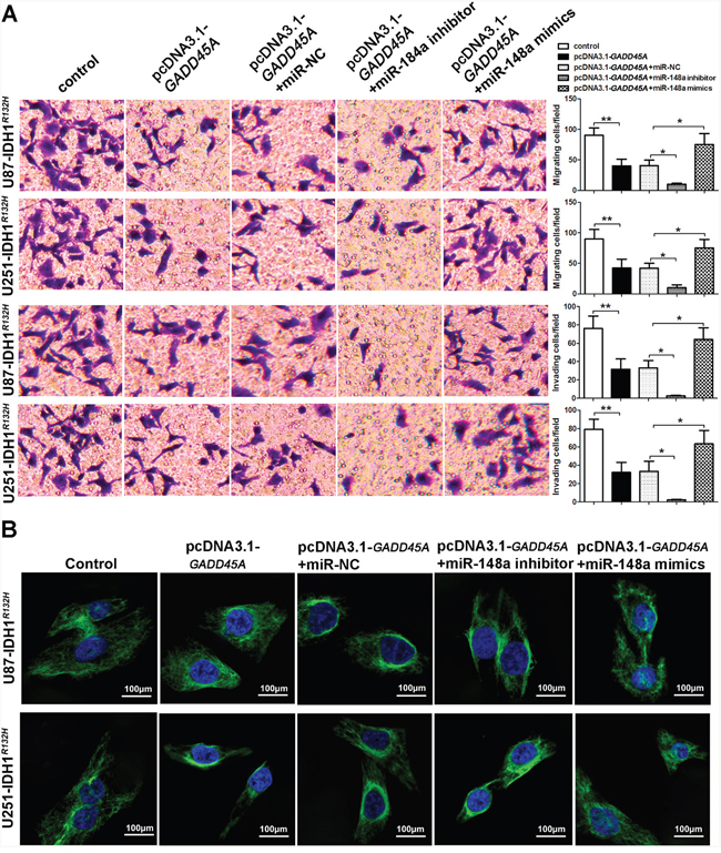 Figure 8: miR-148a increases cell migration and invasion and β-catenin distribution by inhibiting GADD45A in IDH1R132H U87 and U251 cells. (A) Migration and invasion of IDH1R132H U87 and U251 glioblastoma cells were measured using transwell assays. (B) Immunofluorescence staining of β-catenin in IDH1R132H U87 and U251 cells. GADD45A overexpression removed β-catenin from the nucleus and this effect was antagonized by miR-148a. *P<0.05, **P<0.01.