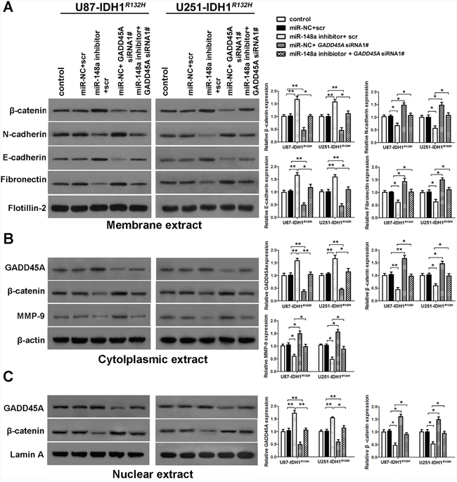 Figure 10: GADD45A inhibits the effects of miR-148a on β-catenin, MMP-9, and EMT marker expression in IDH1R132H glioblastoma cells. (A) Western blot analysis of β-catenin, N-cadherin, E-cadherin, and fibronectin expression in membrane extracts. Flotillin-2 was used as a membrane marker. (B) Western blot analysis of GADD45A, β-catenin, and MMP-9 expression in cytoplasmic extracts. β-actin was used as a control. (C) Western blots analysis of β-catenin and GADD45A expression in nuclear extracts. Lamin A was used as a control. IDH1R132H U87 and U251 cells were transfected with miR-148a inhibitor before transfection with GADD45A siRNA1# or scrambled controls. GADD45A siRNA1# rescued the effects of miR-148a inhibition on protein expression. *P<0.05, **P<0.01.