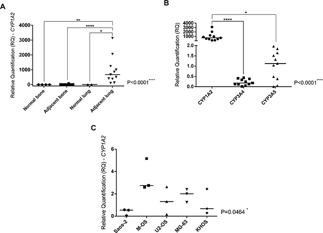 Figure 1: CYP1A2 expression and its correlation with OS metastasis and metastatic tumor microenvironment. A. Kruskal-Wallis Test (p<0.0001). Analyses between two groups were done by Mann-Whitney Test that confirmed CYP1A2 overexpression in adjacent lung to OS metastasis in comparison with normal bone (control of the bone tissue) (p=0.0015), adjacent bone to primary OS (p<0.0001) and normal lung (control of the lung tissue) (p=0.0256). B. Friedman Test (p<0.0001). Dunn’s multiple comparisons test confirmed CYP1A2 overexpression in comparison with CYP3A4 (p<0.0001) and CYP3A5 (p=0.0168) in adjacent lung to OS metastasis. C. Kruskal-Wallis Test. CYP1A2 overexpression in M-OS cell line, established from OS metastasis in the lung (p=0.0464). Statistical significance: *: p<0.05; **: p<0.01; ***: p<0.001; ****: p<0.0001.