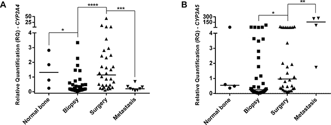 Figure 2: CYP3A4 and CYP3A5 genes expression in OS specimens and normal bone. A. CYP3A4 gene expression. Biopsy presented lower expression than normal bone specimens. Surgery specimens presented higher expression than biopsy. First metastasis from each patient presented lower expression than surgery and normal bone specimens, presenting similar expression to biopsy. B. CYP3A5 gene expression. Surgery specimens presented overexpression than biopsy and lower expression than metastasis at diagnosis specimens. Statistical significance by Mann-Whitney and Wilcoxon Test: *: p<0.05; **: p<0.01; ***: p<0.001; ****: p<0.0001.