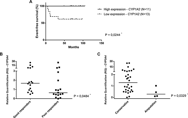 Furthermore, CYPs gene expression showed to be associated with the outcome of OS patients (Figure 3). The survival curves of OS patients were analyzed according high expression (more or equal than median value) and low expression (less than median value) of CYP genes. In this analysis, we have separated two independent groups of patients: metastatic and nonmetastatic at diagnosis, since metastasis at diagnosis is an important prognostic factor in OS. When only nonmetastatic patients at diagnosis were analyzed, the CYP1A2 overexpression in surgery specimens was associated with a better event-free survival (p=0.0244) (Figure 3A). Also, CYP3A4 overexpression in adjacent bone specimens was associated with good response (tumor necrosis grade higher than 90% - grades III and IV) (p=0.0484) and conservative surgery (p=0.0329) (Figure 3B and 3C, respectively).