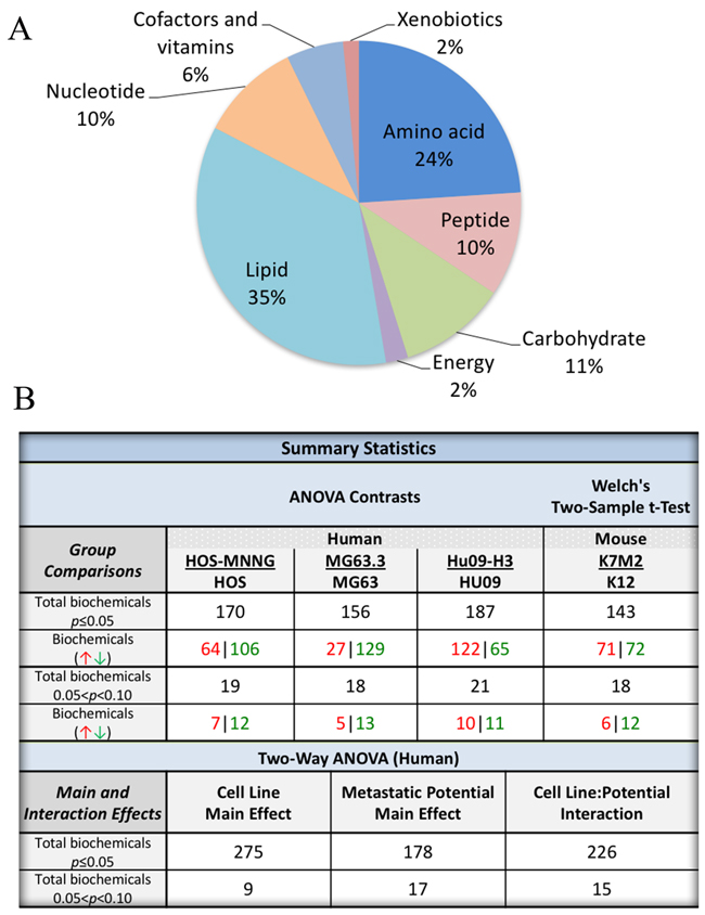 Figure 1: Global metabolomic profiling of 4 pairs of clonally related OS cell lines with high and low metastatic potential. (A) A pie diagram showing the distributions of altered metabolites in the comparison of high/low metastatic OS cell lines. (B) Summary of statistical analysis of metabolic profiling results.