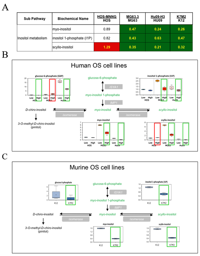 Figure 2: Inositol pathway metabolites are statistically altered in highly metastatic OS cells compared to their low metastatic parental cells. (A) Heat map associated with the statistical analysis of the data. Green: indicates significant difference (p≤0.05) between the groups shown, metabolite ratio of < 1.00. Red: indicates significant difference (p≤0.05) between the groups shown; metabolite ratio of ≥ 1.00. Non-colored text and cell indicates mean values are not significantly different for that comparison. (B) The alterations of the metabolites in the inositol pathway between each pair of human OS cell lines are demonstrated with box plots. (C) Box plots of inositol pathway metabolites in a pair of mouse cell lines.