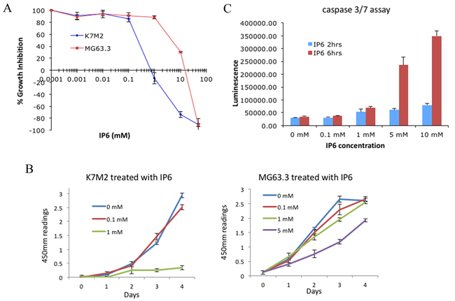 Figure 3: Effect of disrupting the inositol pathway with IP6 in highly metastatic OS cells in vitro. (A) Highly metastatic OS cell lines (MG63.3 and K7M2) were cultured for 48hrs with the indicated concentrations of IP6, followed by staining with sulforhodamine B. Growth is represented as percentage of vehicle treated control. (B) The effects of IP6 treatment on cell proliferation were assessed by CCK-8 assay. (C) Cellular caspase 3/7 activities of K7M2 cells were measured following the addition of 5 mM IP6.