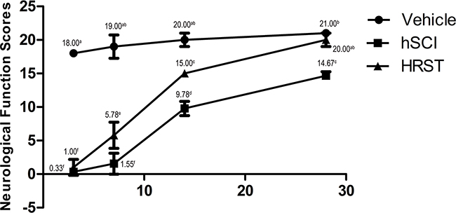 Figure 1: HS treatment improved the neurological function of the hind limbs of rats with hSCI. Neurological function was assessed at 3, 7, 14, and 28 days after surgery. Data are expressed as means ± SD. (n = 9 per group). The Basso, Beattie, Bresnahan (BBB) locomotor scores demonstrated that spinal cord injury markedly affected the hind limb neurological functions of the rats (Figure 1). HS treatment improved the recovery of hind limb neurological function. The rats in the HRST group had the highest BBB scores 28 days after injury (20.00 ± 1.00).