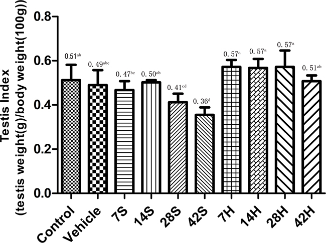 Figure 2: Effects of HS treatment on the testis index after hSCI. The 7S, 14S, 28S, and 42S subgroups were the subgroups analyzed 7, 14, 28, and 42 days after hSCI, respectively. In the HRST group, the 7H, 14H, 28H, and 42H subgroups indicated 7, 14, 28, and 42 days of HS treatment after hSCI. The testis indices of rats were significantly decreased in the hSCI group than in the control and vehicle groups (0.41 ± 0.04cd, 0.36 ± 0.03d vs. 0.51 ± 0.03ab, 0.49 ± 0.04abc). The testis indices were significantly higher in the HRST group than in the hSCI group (0.51 ± 0.03ab vs. 0.36 ± 0.03d). Values with different superscript letters (a–d) above the bars differ significantly (p < 0.05). Data are expressed as means ± SD. (n = 6 per group).