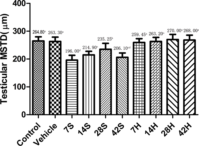 Figure 4: Effects of HS administration on testicular MSTD after hSCI. The testicular MSTD was significantly decreased in the hSCI group than in the control and vehicle groups (206.10 ± 15.83cd vs. 264.80 ± 15.18a and 263.30 ± 15.43a). However, the MSTD was significantly higher in the HRST group than in the hSCI group (268.00 ± 17.75a vs. 206.10 ± 15.83cd). Values with different superscript letters (a–d) above the bars differ significantly (p < 0.05). Data are expressed as means ± SD.