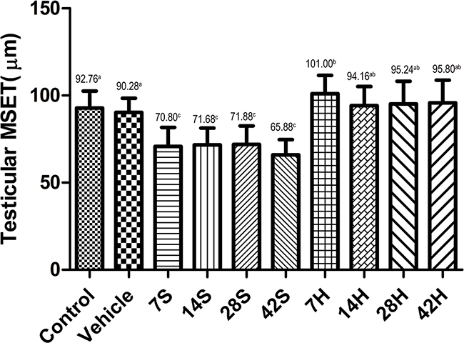 Figure 5: Effects of HS treatment on testicular MSET after hSCI. The testicular MSET was significantly decreased in the hSCI group than in the control and vehicle groups (65.88 ± 5.83c vs. 92.76 ± 8.85a and 90.28 ± 8.22a). Note that HRST groups showed a significant increase in MSET (95.80 ± 7.04ab vs. 65.88 ± 5.83c). Values with different superscript letters (a–c) above the bars differ significantly (p < 0.05). Data are expressed as means ± SD.