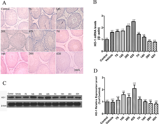 As shown in Figure 6A, the areas stained positive for HO-1 were stained brownish, and the control group showed weakly positive for HO-1. Marked activation of HO-1 was observed in the majority of germ cells after hSCI, especially near the luminal surface of seminiferous tubules. In contrast, HO-1 expression was obviously decreased in the HRST group than in the hSCI group (Figure 6A). Similarly, the results of the real-time qRT-PCR and Western blot analysis revealed that the HO-1 mRNA transcript and protein levels were considerably higher in testicular tissue of the hSCI group, while HO-1 expression was reduced in the HRST group (Figure 6B, 6C, and 6D).