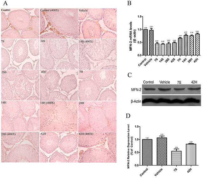 MFN-2 was primarily expressed in the testicular interstitial cells of the control and vehicle groups (Figure 7A). Interstitial cells were stained brownish-yellow in each group. The MFN-2 level was significantly reduced 7 days after injury, while MFN-2 in the cytoplasm was markedly activated in the HRST group, especially at 14 days after HS administration (Figure 7A). Real-time qRT-PCR and Western blot analysis indicated that the transcriptional level and immunoreactivity of MFN-2 were greatly decreased in the testicular tissues in the hSCI group, but MFN-2 expression was significantly increased in the HRST group (Figure 7B, 7C, and 7D). These findings were consistent with the immunohistochemistry results.