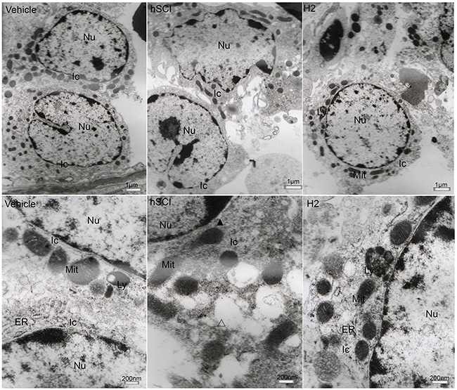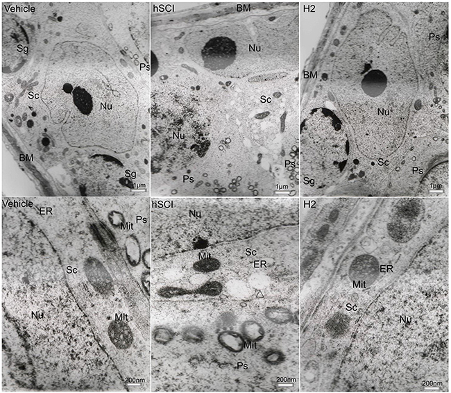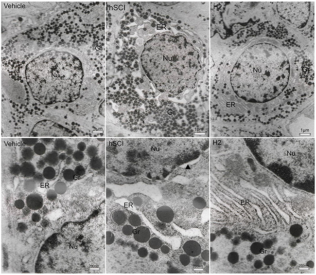 Figure 9: Ultrastructural changes in the gonadotroph cells of pituitary. Representative TEM micrographs showing the ultrastructure of gonadotroph cells. (Upper three microphotographs were taken low magnification and the lower three were taken at high magnification.) hSCI: hSCI group; H2: HRST group; Nu: Nucleus; ER: Endoplasmic reticulum; Gr: Secretory granules; ▲: perinuclear space, the same as follows. Less damage of gonadotroph cells was observed in vehicle group, including dilation of the ER, the slight damage of nuclear and mitochondrial membrane. After hSCI, severe damage was observed in hSCI group, including cellular swelling, dilation of perinuclear spaces and ER. There was only slight changes in HRST group.