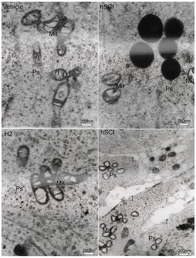 The animals were fed a standard diet for at least 1 week before the surgery, and then randomly divided into the following four groups: (1) normal control group (n = 9), which received no treatment; (2) vehicle group, in which rats were sham-operated and given intraperitoneal injection of 5–6 mL physiological saline per kg body weight once a day (n = 9), (3) hSCI group, in which rats were subjected to hSCI plus intraperitoneal injection of 5–6 mL/kg physiological saline (n= 36), (4) Hydrogen-rich saline-treated (HRST) group, in which rats were subjected to hSCI plus 5–6 mL/kg HS injection (n = 36). Of these, the hSCI and HRST groups were divided into four subgroups (n = 9 per subgroup), namely, 1, 2, 4, and 6 weeks after hSCI or HRST subgroups.