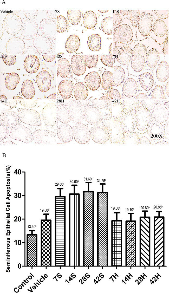 Figure 13: HS administration prevents the hSCI-induced testicular germ cell apoptosis. Representative micrographs of TUNEL staining of seminiferous tubules in the vehicle, hSCI (7S, 14S, 28S, and 42S), and HRST (7H, 14H, 28H, and 42H) groups. Apoptotic cells in the seminiferous tubules were identified as those with a brown-stained nucleus. Apoptotic cells were observed mainly in spermatogonia and spermatocytes. Magnification: 200×. Quantitative analysis of apoptotic cells in different groups. hSCI markedly increased the number of TUNEL-positive cells when compared with the control and vehicle groups (31.25 ± 2.65c vs. 13.30 ± 1.04a and 19.50 ± 1.58b, respectively). Note that the number of TUNEL-positive cells in the HRST group showed a significant decrease when compared with that of hSCI group (20.85 ± 1.37b vs. 31.25 ± 2.65c). Values with different superscript letters (a–c) differ significantly (p < 0.05). Data are expressed as means ± SD. (n = 6 per group).